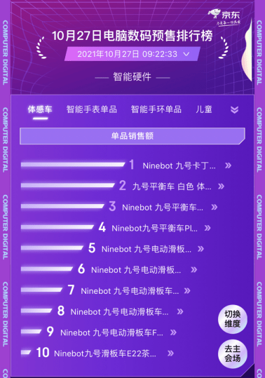 感车范围例如体,均衡车、电动滑板车九号公司的卡丁车、,俘获一多消费者芳心依据革新科技轻松,卡丁车Pro升级款同时上榜的有九号,车Plus、Nano九号均衡车、九号均衡,30、F25、C15等多个型号产物九号电动滑板车ES1L、E22、F,数码预售排行榜的最大黑马成为京东11.11电脑,感车品类的闭怀和青睐也响应出消费者对付体。