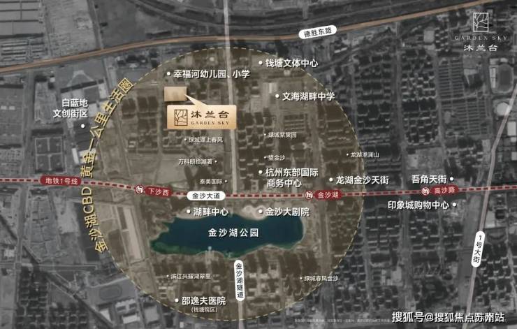 景图内交际通上金沙湖配套实,钱塘疾速途、东湖高架途沐兰台以德胜疾速途、,纵”主轴交通修建“两横一,1号线米直距地铁,世纪城、滨江高新板块、西湖风物区等主旨板块协同串联钱江新城二期、杭州东站合键、奥体,宜业特质凸显板块的宜居。