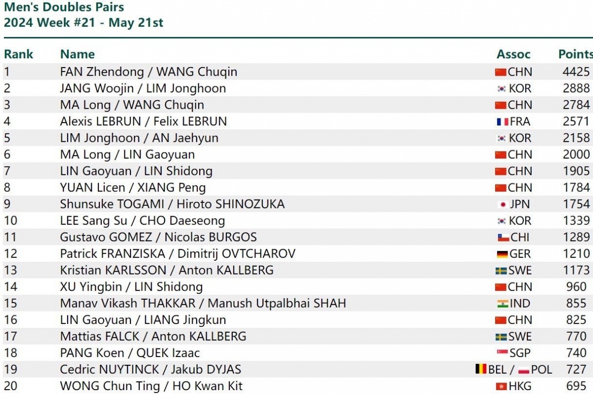 方面男双,425分排名第1位樊振东/王楚钦4,林忠勋第2张禹珍/,楚钦第3马龙/王,马龙第6林高远/。
