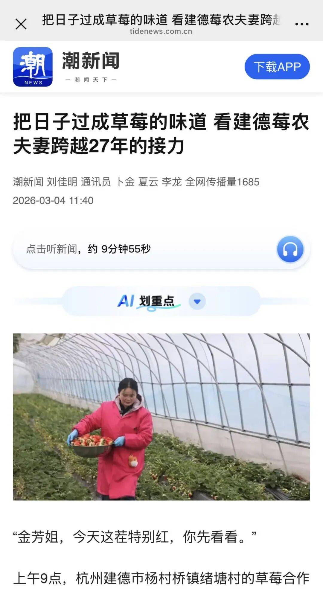 4日3月,丈夫傅剑隔着130多公里接力卖草莓潮音讯客户端报道修德莓农汪金芳与。里种草莓、收草莓汪金芳正在修德村,州卖草莓傅剑正在杭。年来27,亩自种地起步两人从10,设立配合社方今正在村里,了草莓的滋味将日子过成。8日3月,报道三八节当天潮音讯客户端,是超人”共富工坊里修德洋溪街道“妈妈,是宝妈和本村妇女70多位员工多,杀青家门口就业通过美食手作等。前目,余家巾帼共富工坊修德已修成70,余名妇女就业发动3400。