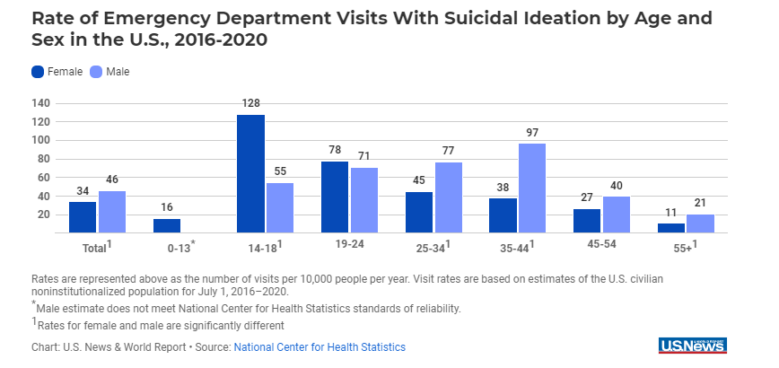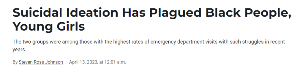 闻与宇宙报道》网站本地时光13日报道中国日报网4月14日电 据《美国新,究注解最新研,年来近,诊室的比率存正在浩大不同美国有寻短见目标的人去急,受影响最大的群体黑人和年青女性是。而言总体,到2021年上升了4.4%美国人的寻短见率从2020年,1年上升了30%以上2021年比200。