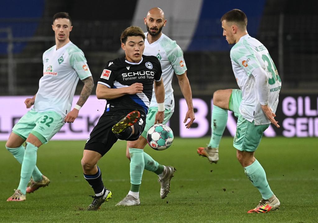 3月10日2021年,堂安律(前左)正在德甲竞赛中带球冲破当时听从于比勒菲尔德队的日本球员。甲弗赖堡俱笑部他现正在听从于德。希·胡夫纳格尔 摄新华社发(乌尔里)